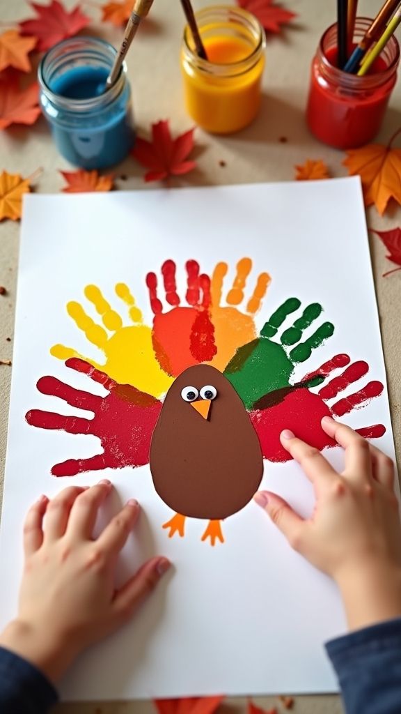- Paint the Feathers: Using a brush, paint your child’s hand with one color at a time (red, yellow, orange, green). Press their hand onto the paper, forming a semicircle of handprints, these will be the turkey’s feathers. Let it dry.